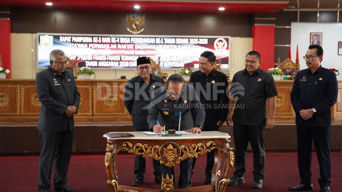 Setelah penyampaian pendapat akhir seluruh fraksi, rapat dilanjutkan dengan pengambilan keputusan. Berdasarkan hasil persetujuan bersama, DPRD Kabupaten Sanggau dan Pemerintah Daerah sepakat untuk menetapkan Raperda APBD Kabupaten Sanggau Tahun Anggaran 2026 menjadi Peraturan Daerah.