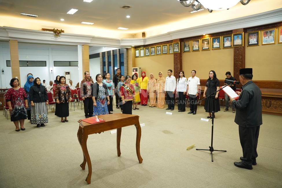 SANGGAU - Bupati Sanggau, Drs. Yohanes Ontot, M.Si didampingi Wakil Bupati Sanggau, Susana Herpena, S.Sos., M.H menghadiri sekaligus melantik Kelompok Kerja (Pokja) Bunda PAUD Kabupaten Sanggau Periode 2026–2031. Kegiatan tersebut dilaksanakan di Aula Daranante Kantor Bupati Sanggau, Rabu (25/03/2025).