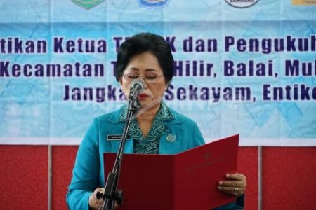 SANGGAU — Ketua Tim Penggerak Pemberdayaan dan Kesejahteraan Keluarga (TP PKK) Kabupaten Sanggau, Arita Apolina, Senin (27/2) pagi melantik Ketua TP PKK sekaligus mengukuhkan Bunda PAUD Kecamatan Tayan Hilir, Balai, Mukok, Bonti, Jangkang, Sekayam dan Entikong.