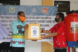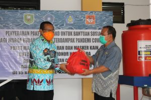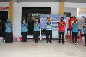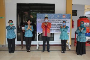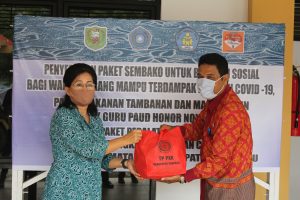 Ketua TP-PKK Kabupaten Sanggau, Ny. Arita Apolina menyerahkan sembako berupa 100 paket untuk kelompok dasawisma kecamatan yang kurang mampu dari TP PKK Kabupaten Sanggau, 30 Paket tambahan untuk guru honor Paud di luar honor Daerah dari Bunda Paud Kab. Sanggau, Alat cuci tangan ember dari PKK Kabupaten dan alat cuci tangan pinguin dari Bunda Paud.